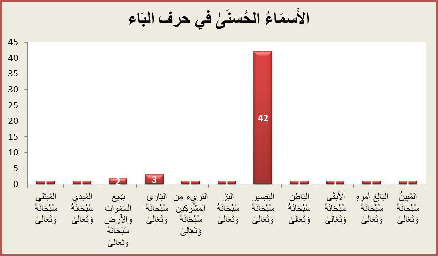 وَرَدَ في حرف الباء ١٠ جذور للأسماء الحسنى، اجمالي الأسماء في حرف الباء ١١ اسماً أحسناً. وتكررت ٥٥ مرة. فيما يلي جذور حرف الباء وما يحتويه من أسماء حُسنى:
